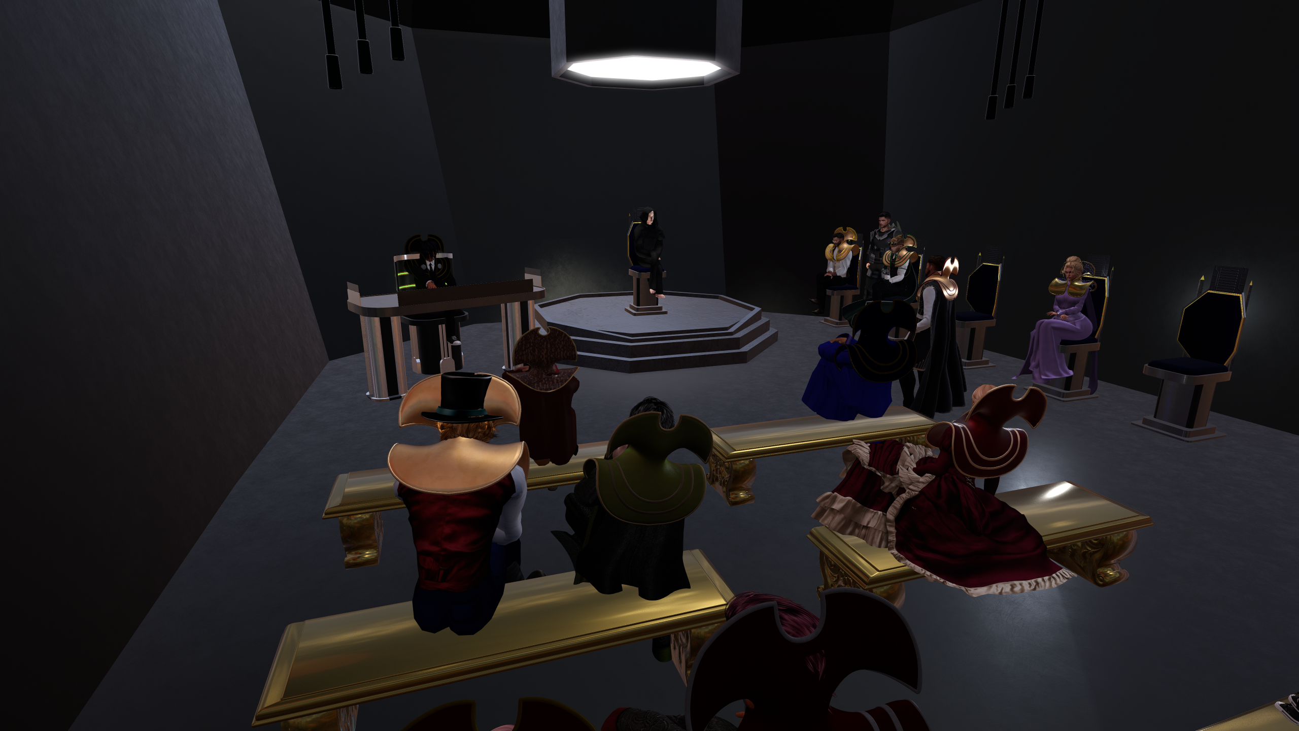 The chamber gathered itself slowly, like a storm learning its shape. Lady Rowan entered with a quiet grace, offering polite smiles that softened the edges of the room, while Rain Chronotis followed with a brighter energy, her return announced with a wave that seemed to ripple through the assembly. Lady Chronotis took her seat with composed elegance, adjusting cloak and headdress before casting a gentle, knowing smile toward her husband, Lord President Chronotis, who bore the weight of the day in stillness. Nearby, Lord Conundrum settled into place, distracted by thoughts of tailoring and appearances, while Lord Darkfyre acknowledged Lady Rowan with a courteous greeting, his tone measured but not unkind.